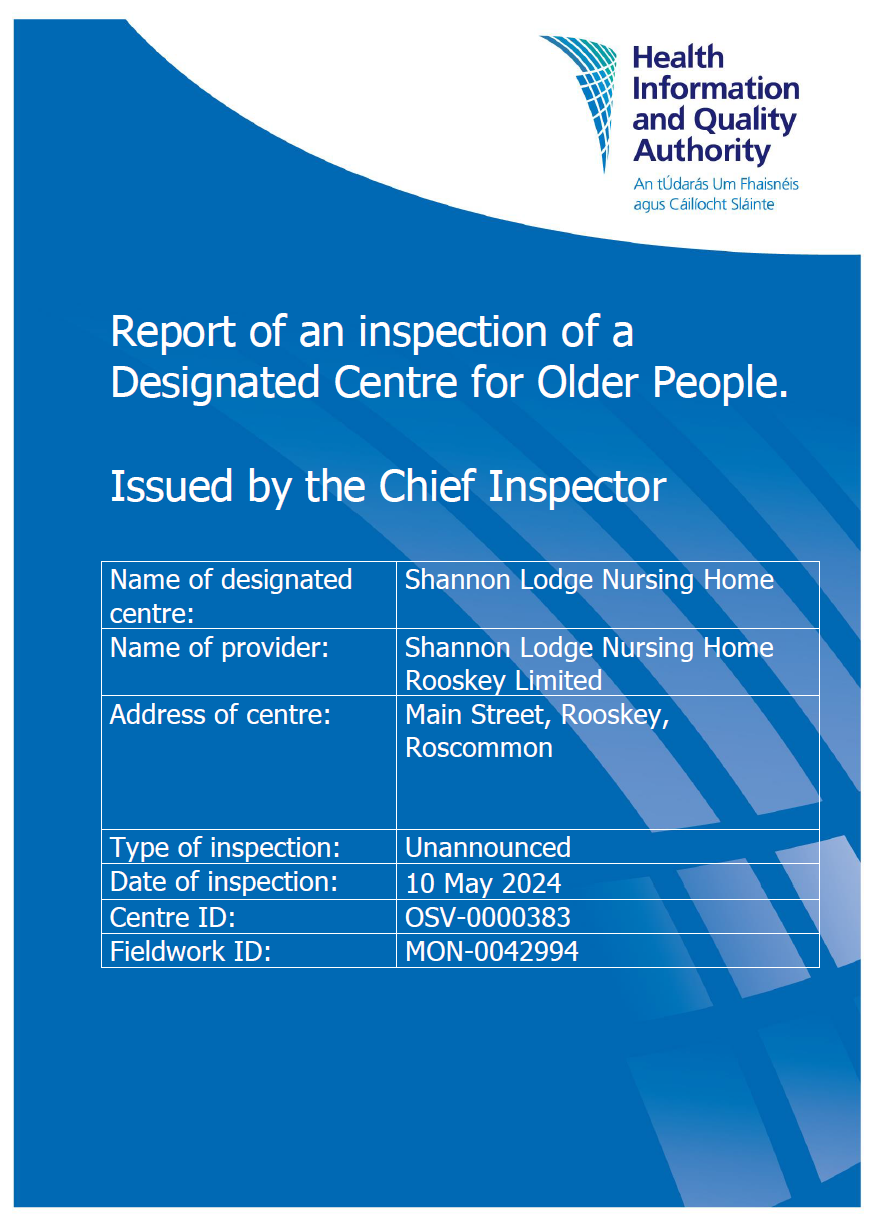 The Health Information and Quality Authority (HIQA) is an independent body established to promote high-quality and safe care across Ireland’s health and social care services. HIQA sets standards, inspects services, and provides reviews to ensure accountability and continuous improvement. At Shannon Lodge Nursing Home, we welcome HIQA’s role in supporting transparency and excellence in care, and we are committed to meeting and exceeding the standards set out in their inspections.